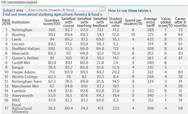 2016《衛報》英國大學農業,林業和食品專業排名--優越教育