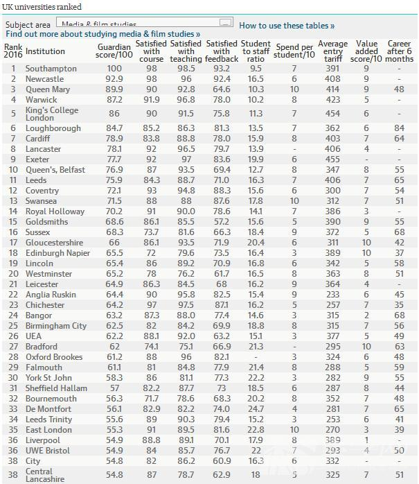 2016《衛(wèi)報(bào)》英國(guó)大學(xué)媒體與電影研究專(zhuān)業(yè)排名--優(yōu)越教育