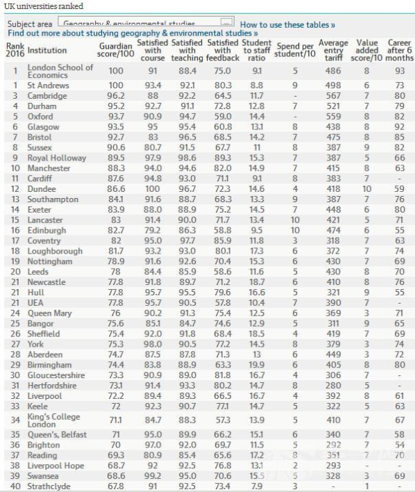 英國《衛報》發布了英國大學綜合排名,同時也發布了2016《衛報》英國大學專業排名,根據最新的2016《衛報》英國大學地理及環境研究專業排名可以看出,此次排名位于首位的是倫敦政治經濟學院和圣德安魯斯大學,第三名為劍橋大學,第四名為杜倫大學,第五名為牛津大學,具體如下: