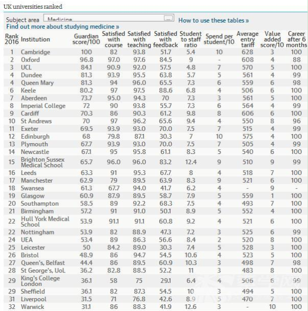 2016《衛報》英國大學醫學專業排名--優越教育