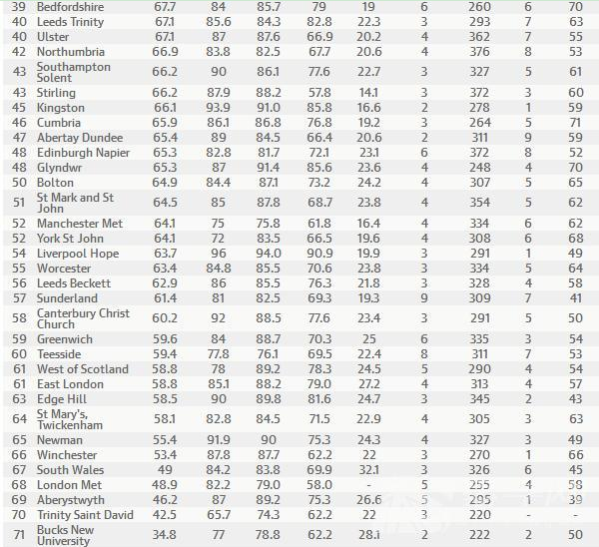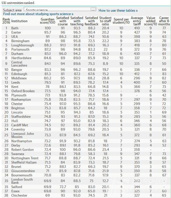 英國《衛報》發布了英國大學綜合排名,同時也發布了2016《衛報》英國大學專業排名,根據最新的2016《衛報》英國大學運動科學專業排名可以看出,此次排名位于首位的是巴斯大學,第二名為埃克塞特大學,具體如下: