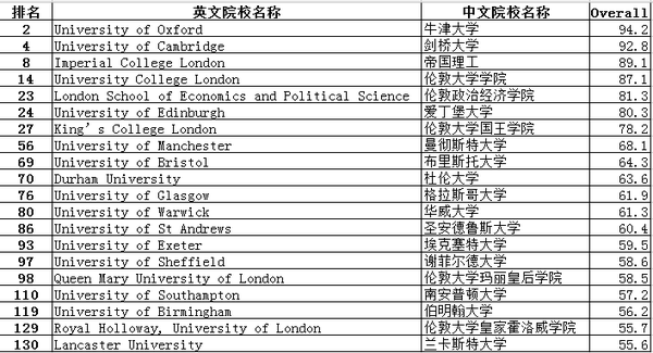 The Times的排行亦是針對英國學生所做,由英國的大報報紙所提供。
