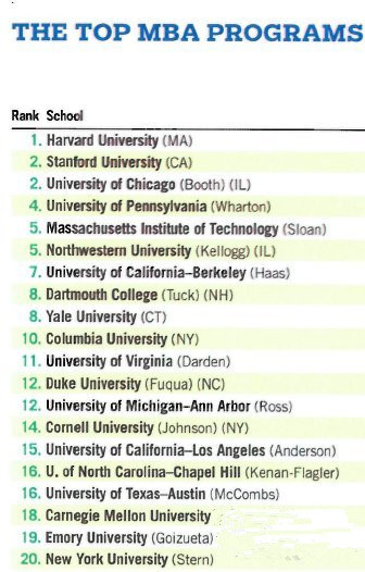 ??在MBA項(xiàng)目的排名中,哈佛、斯坦福、芝加哥大學(xué)布斯商學(xué)院、賓夕法尼亞大學(xué)沃頓商學(xué)院和麻省理工大學(xué)斯隆管理學(xué)院位列前五。