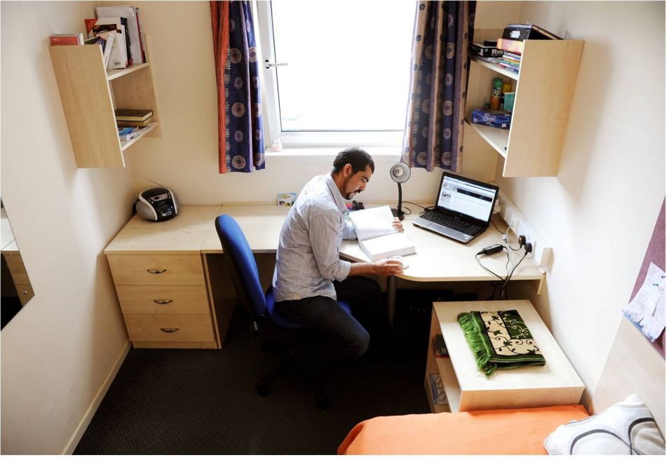 ??(1) 床。有分單人床和高低床。高低床有分上下鋪,和上鋪下桌兩種。(2) 床上用品。通常只提供床墊和枕頭,床單被套之類的是需要學生自己準備的。(3) 家具。桌椅,衣柜是標配,好一點的還會配得有沙發、餐桌等。(4) 電器。空調、暖氣是標配,好一點的會配有臺燈、電視,有單獨廚房的宿舍就會配冰箱、烤箱、灶臺、抽煙機等。(5) 衛生間和浴室。分為公共和單獨的,衛生間都是馬桶,單獨的浴室甚至配得有浴缸。(6) 洗衣房。一般都是公共的洗衣機和烘干機。也有收費和免費的區別。
