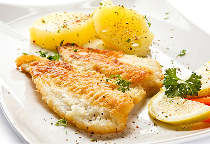 制作:首先將鱈魚切成塊狀,然后把調料和其它作料涂抹在鱈魚塊上,放入鍋內炸至色澤金黃即可。