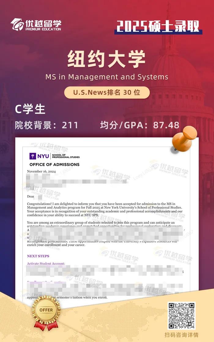 25fall碩士重磅offer來(lái)襲!恭喜優(yōu)越學(xué)員順利斬獲美國(guó)紐約大學(xué)錄取,一起來(lái)看看offer詳情吧!