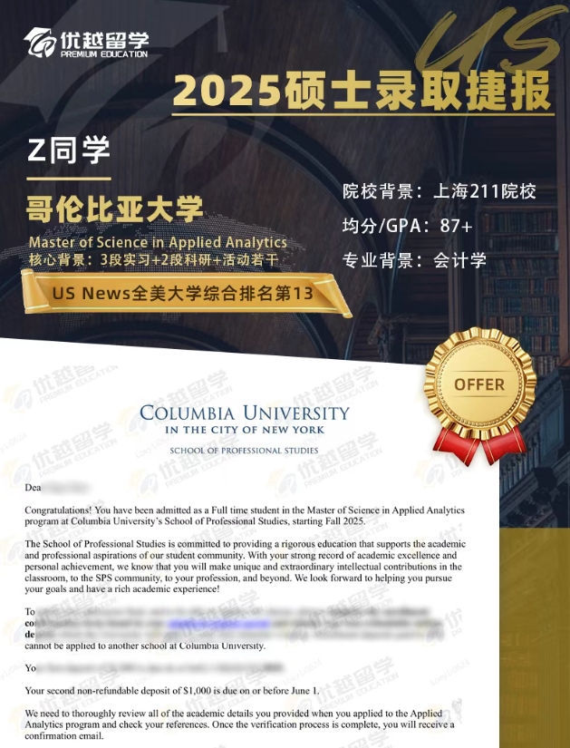 以上是【本期offer榜單:【【碩士案例】211會計專業,錄取哥倫比亞大學應用分析碩士】相關的全部內容,查看更多【offer榜單】、【名校案例】相關資訊可前往【優越留學】首頁!世界名校申請,找優越留學!選校定校、申請規劃、文書寫作、背景提升、方案定制一套搞定!點擊【在線咨詢】,優越留學顧問24h在線為您一對一解答!