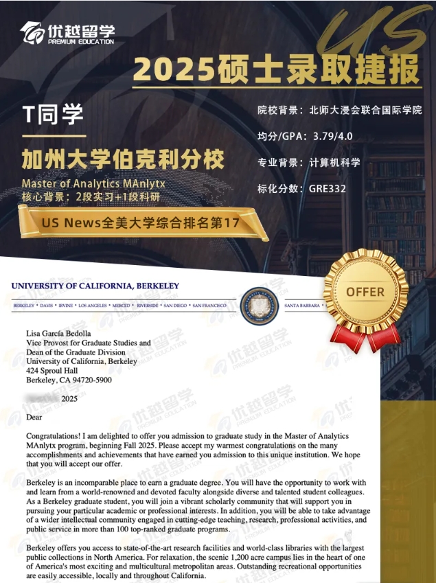 以上是【【美國碩士】中外合作計算機背景,錄取加州大學伯克利分校分析學碩士】相關的全部內容,查看更多【美國碩士錄取】相關資訊可前往【優越留學】首頁!詳細申請規劃及方案定制請預約優越留學顧問為你一對一解答!